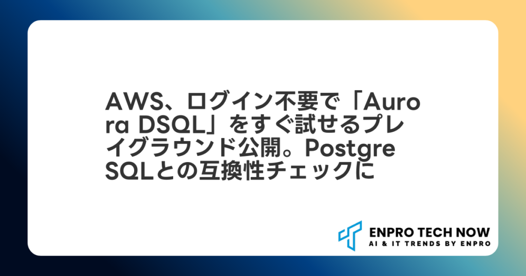 AWS、ログイン不要で「Aurora DSQL」をすぐ試せるプレイグラウンド公開。PostgreSQLとの互換性チェックに